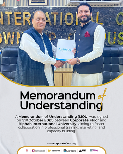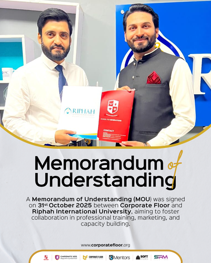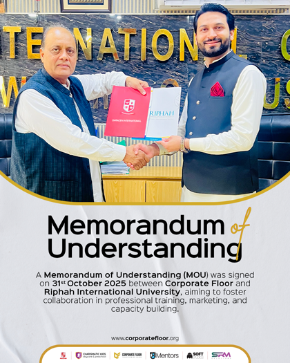 A Memorandum of Understanding (MOU) was signed on 31st October 2025 between Corporate Floor and Riphah International University, aiming to foster collaboration in professional training, marketing, and capacity building.